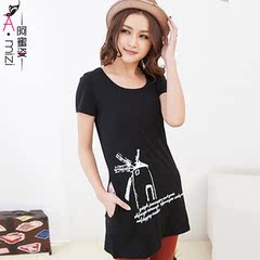 夏装休闲T恤时尚印花修身显瘦圆领棉短袖中长款打底T恤上衣女